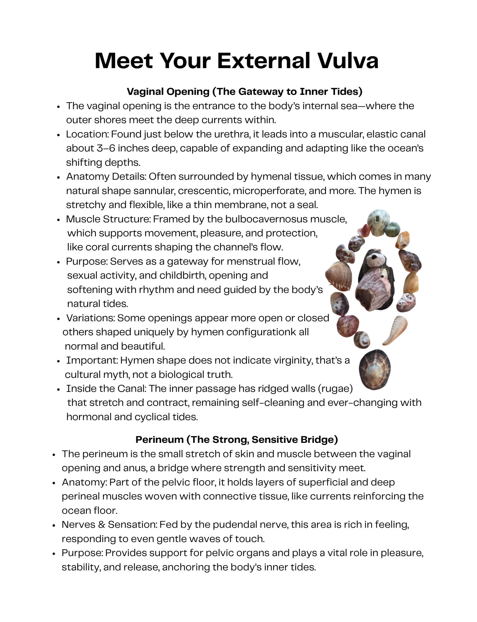 Like the ocean, healing moves in waves. Each offering is designed to meet you where you are—whether you're seeking safe touch, creative expression, or deep education. All sessions are trauma-informed, consent-centered, and rooted in the belief that every body deserves to feel empowered, seen, and celebrated.Empowerment Workshops for Vulva Owners